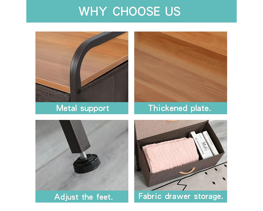 - Material: Metal Frame, Non-Woven Fabric Drawers, MDF Top