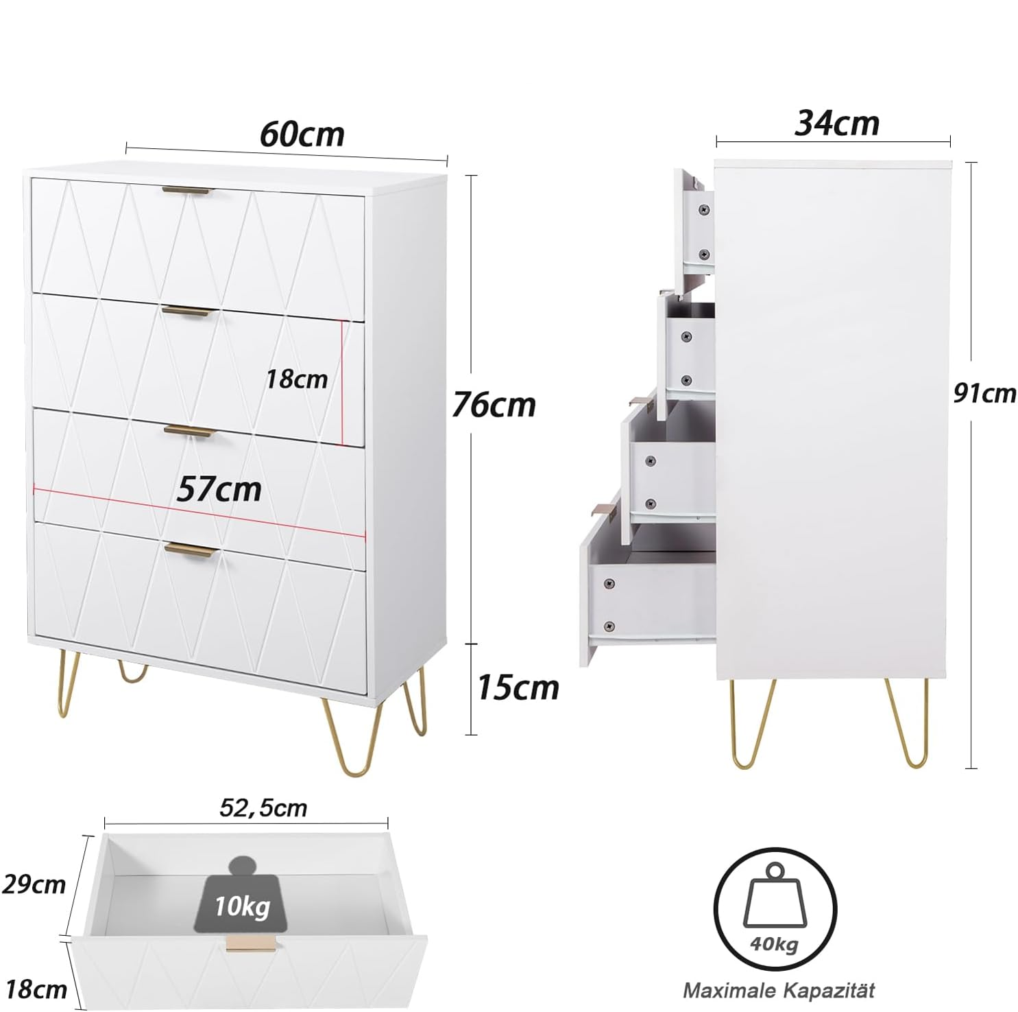 This White 4-Drawer Dresser boasts a modern design with a unique diagonal pattern, adding a stylish touch to any room. The elegant golden handles enhance the dresser's aesthetic, making it a perfect choice for those seeking a modern storage cabinet. Crafted with superior materials and expert craftsmanship, this 4-Drawer Dresser offers both beauty and functionality in your bedroom, closet, or hallway.