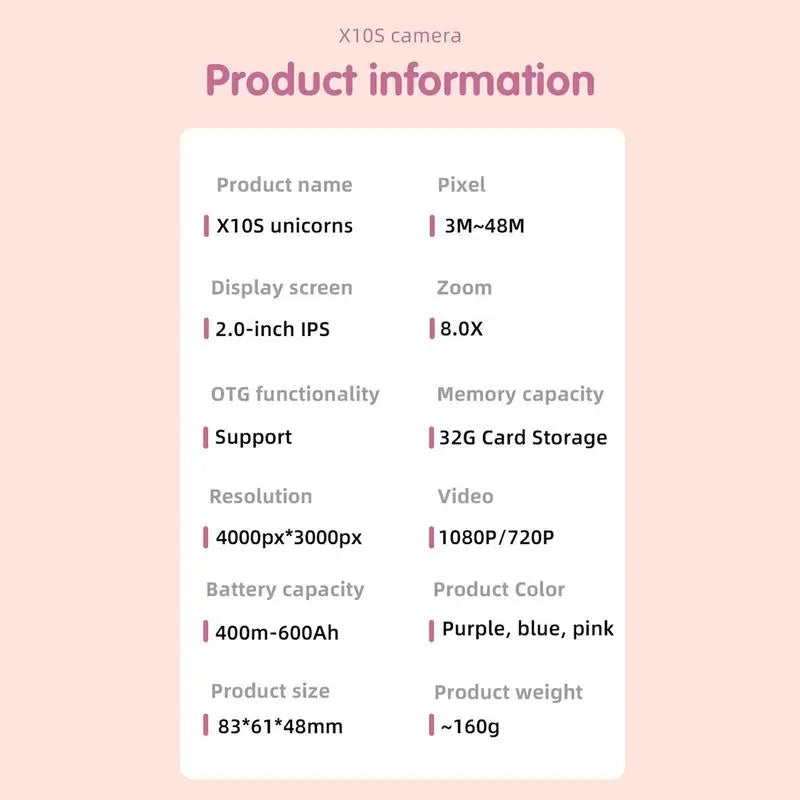 Introducing the colorful unicorn Kids Camera - the perfect Christmas or birthday gift for boys and girls aged 3 to 9. This Kids Camera ignites creativity and fun, combining learning and play in one delightful device. Available in charming Blue , this Kids Camera is ideal for young adventurers.