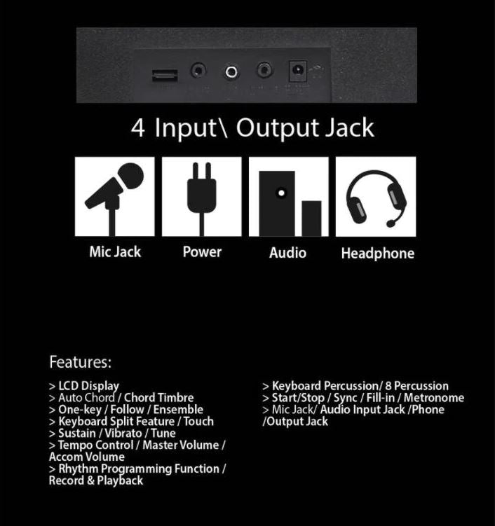 Mobile phones and other audio devices can be connected to the electronic keyboard for playback. The keyboard features a versatile plug type AU Plug, and can be powered by either wall power or 6 x AA 1.5V batteries (batteries not included), making it ideal for both home and travel use.